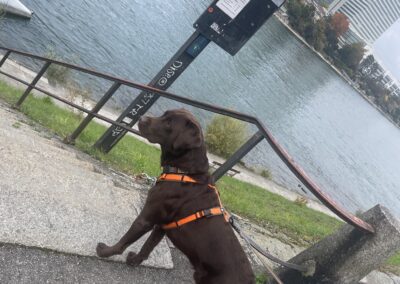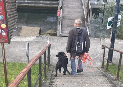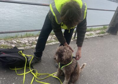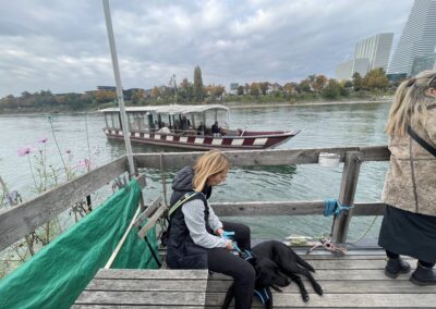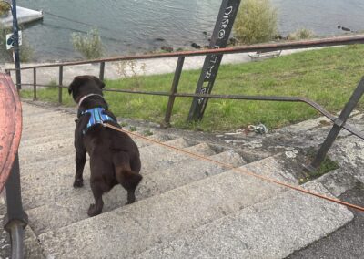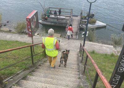 Die Hunde liefen den Trail und am Fährieinstieg wünschte ich viel Glück. Ursi musste für Ueli einspringen, zum ersten Mal trailen und dann sowas, doch Nocca lies sich nichts anmerken und trailte als ob nichts anders wäre. Monika wartete direkt bei der Fähre, doch da musste ich sie enttäuschen, ein bisschen musste zuerst noch gearbeitet werden. Ich musste 8x die Treppe hoch zur Brücke, am Ende nahm ich Flynn selbst an die Leine, so war es mein schnellster Aufstieg. Ein bisschen Spass muss sein. Mit Sandy ging ich dann auch mit, während die anderen schon gemütlich im Restaurant sassen.
