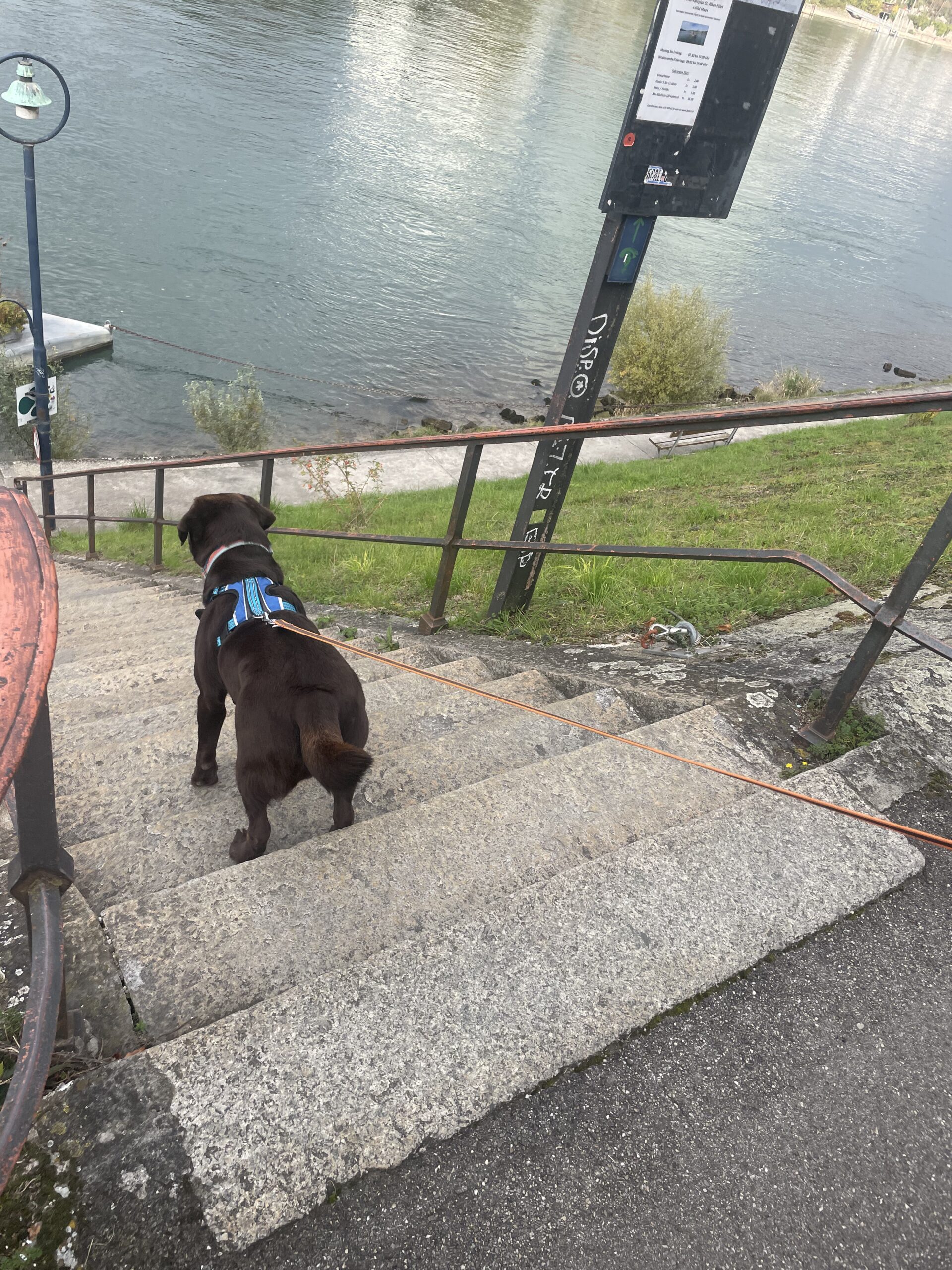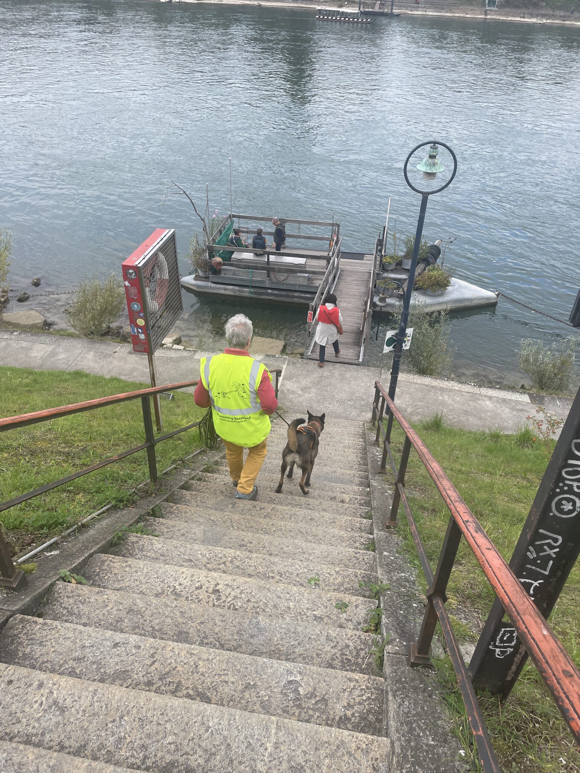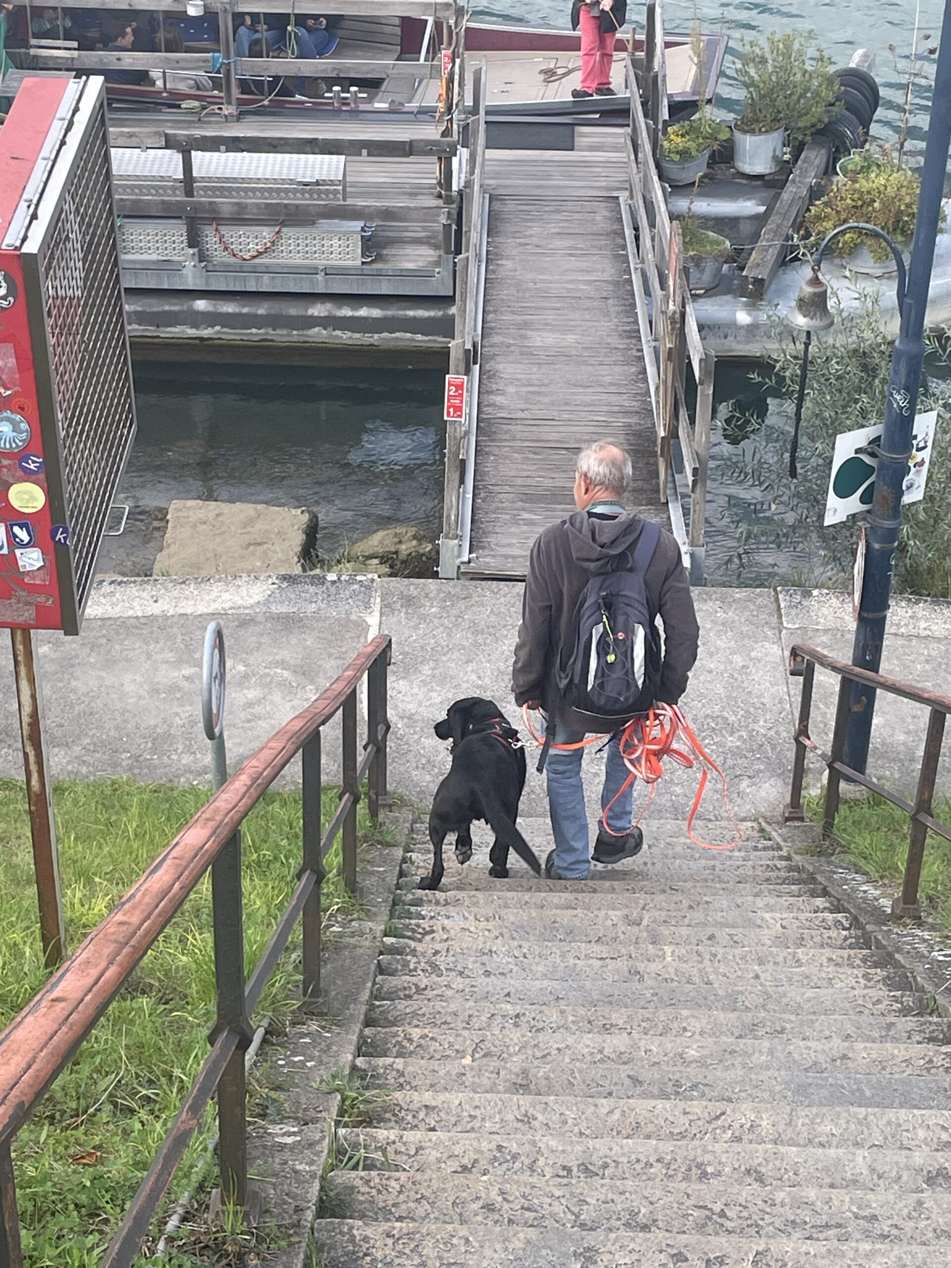 Die Hunde liefen den Trail und am Fährieinstieg wünschte ich viel Glück. Ursi musste für Ueli einspringen, zum ersten Mal trailen und dann sowas, doch Nocca lies sich nichts anmerken und trailte als ob nichts anders wäre. Monika wartete direkt bei der Fähre, doch da musste ich sie enttäuschen, ein bisschen musste zuerst noch gearbeitet werden. Ich musste 8x die Treppe hoch zur Brücke, am Ende nahm ich Flynn selbst an die Leine, so war es mein schnellster Aufstieg. Ein bisschen Spass muss sein. Mit Sandy ging ich dann auch mit, während die anderen schon gemütlich im Restaurant sassen.