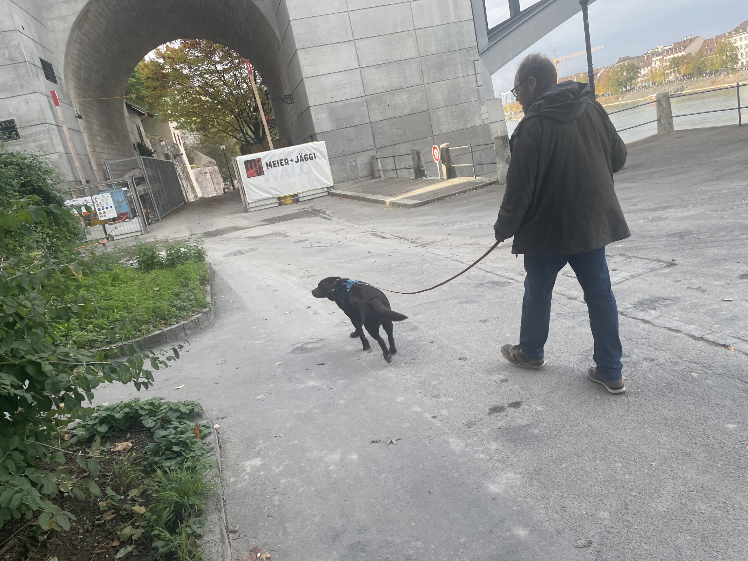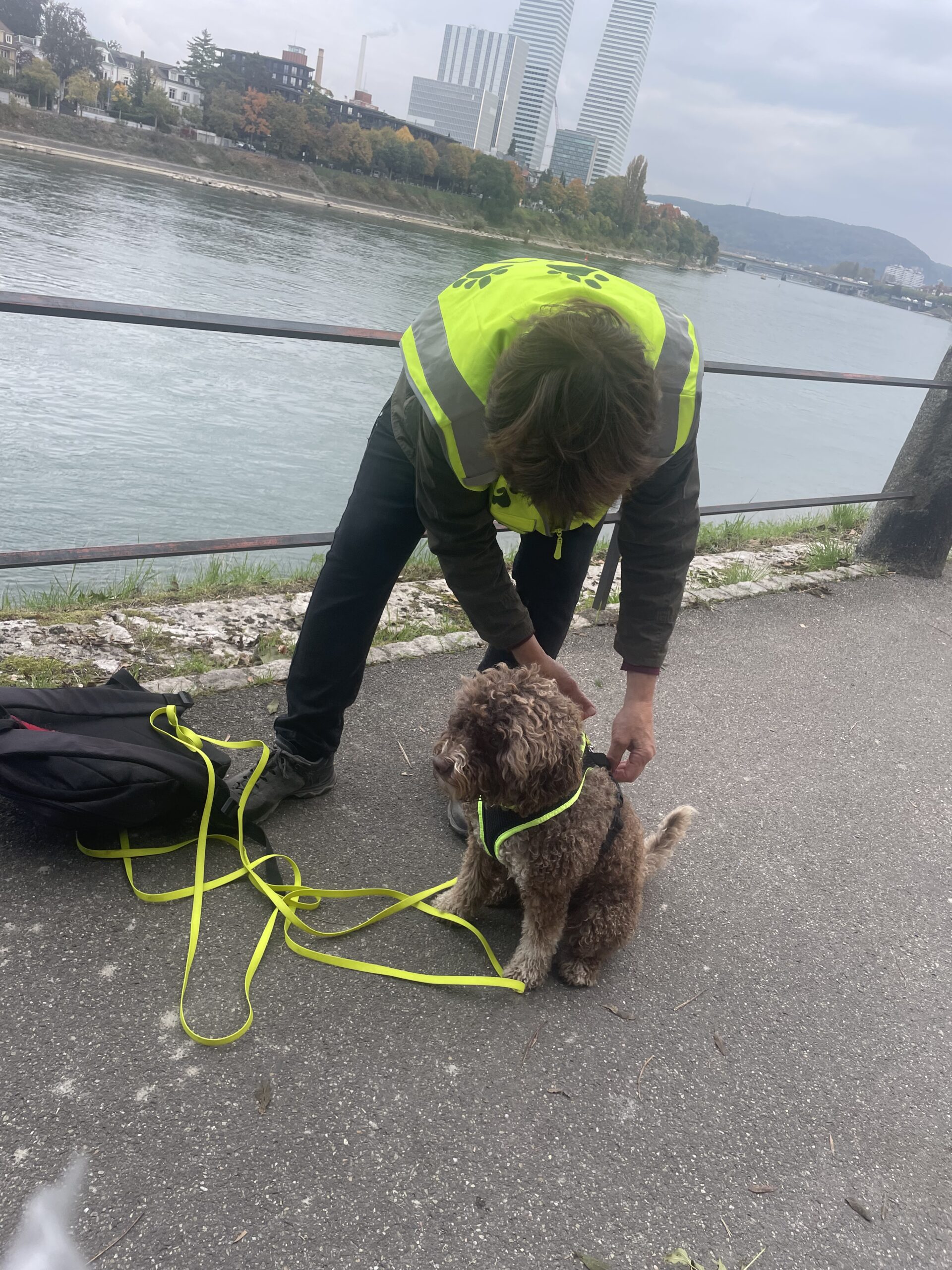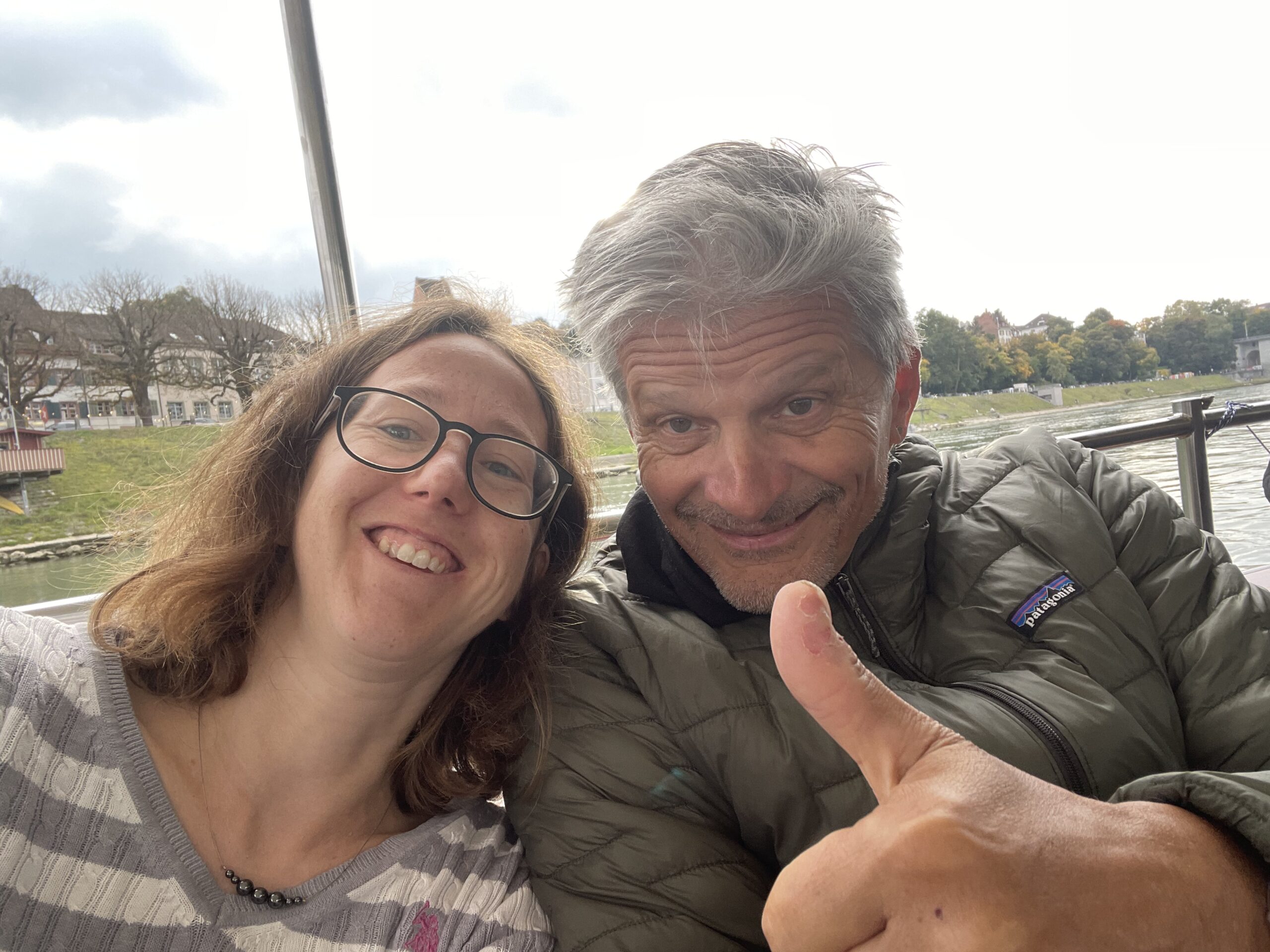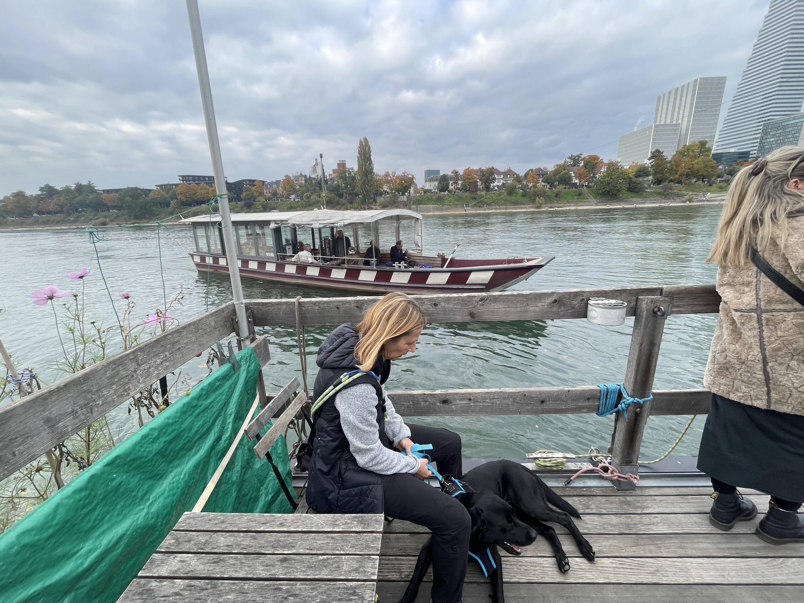 Die Hunde liefen den Trail und am Fährieinstieg wünschte ich viel Glück. Ursi musste für Ueli einspringen, zum ersten Mal trailen und dann sowas, doch Nocca lies sich nichts anmerken und trailte als ob nichts anders wäre. Monika wartete direkt bei der Fähre, doch da musste ich sie enttäuschen, ein bisschen musste zuerst noch gearbeitet werden. Ich musste 8x die Treppe hoch zur Brücke, am Ende nahm ich Flynn selbst an die Leine, so war es mein schnellster Aufstieg. Ein bisschen Spass muss sein. Mit Sandy ging ich dann auch mit, während die anderen schon gemütlich im Restaurant sassen.